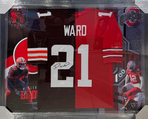 Cleveland Browns / The Ohio State University Buckeyes Denzel Ward Hand Signed Autographed Custom Split Jersey Framed with Large Photo Print Background Includes JSA COA