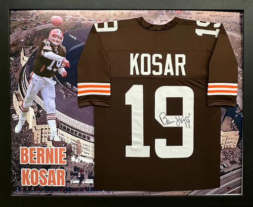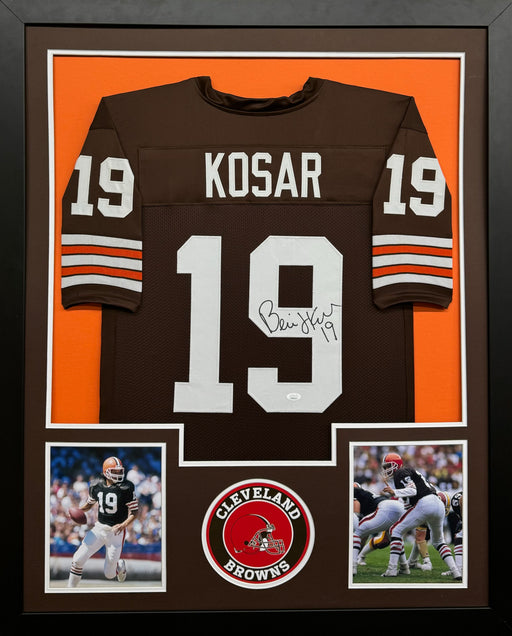Cleveland Browns Bernie Kosar Hand Signed Autographed Custom Brown Jersey Framed with Large Photo Print Background Includes JSA COA
