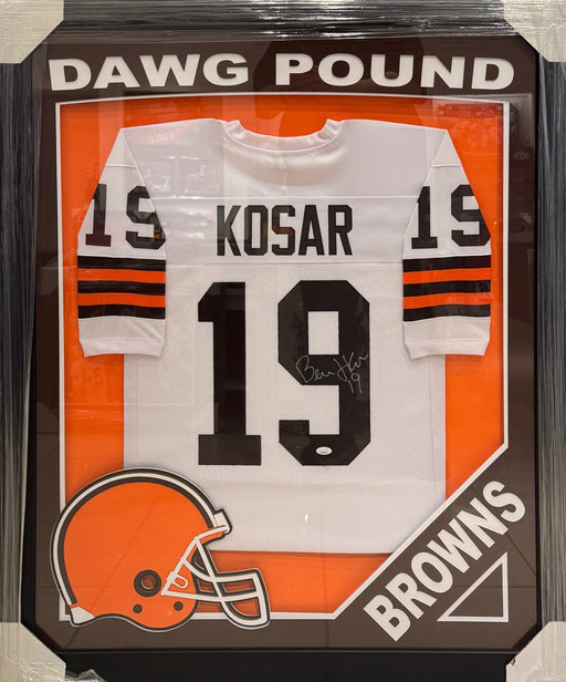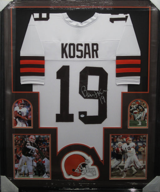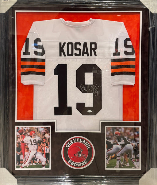 Cleveland Browns Bernie Kosar Hand Signed Autographed Custom White Jersey Framed with Matting, XL 3D Logo, & Cutout Lettering Includes JSA COA