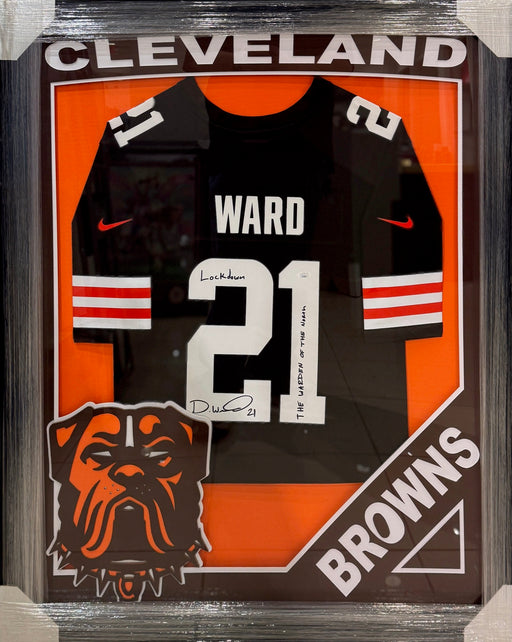 Cleveland Browns Denzel Ward Hand Signed Autographed Nike Authentic Brown Jersey with Lockdown & The Warden Of The North Inscriptions Framed with Matting, XL 3D Logo, & Cutout Lettering Includes JSA COA