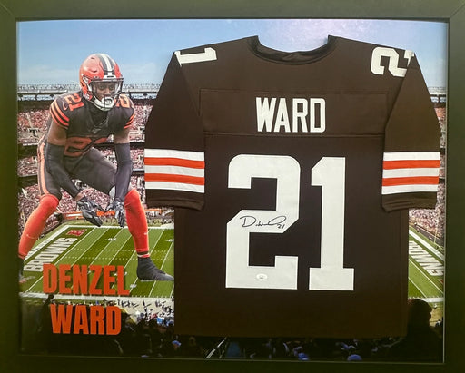 Cleveland Browns Denzel Ward Hand Signed Autographed Custom Brown Jersey Framed with Large Photo Print Background Includes JSA COA